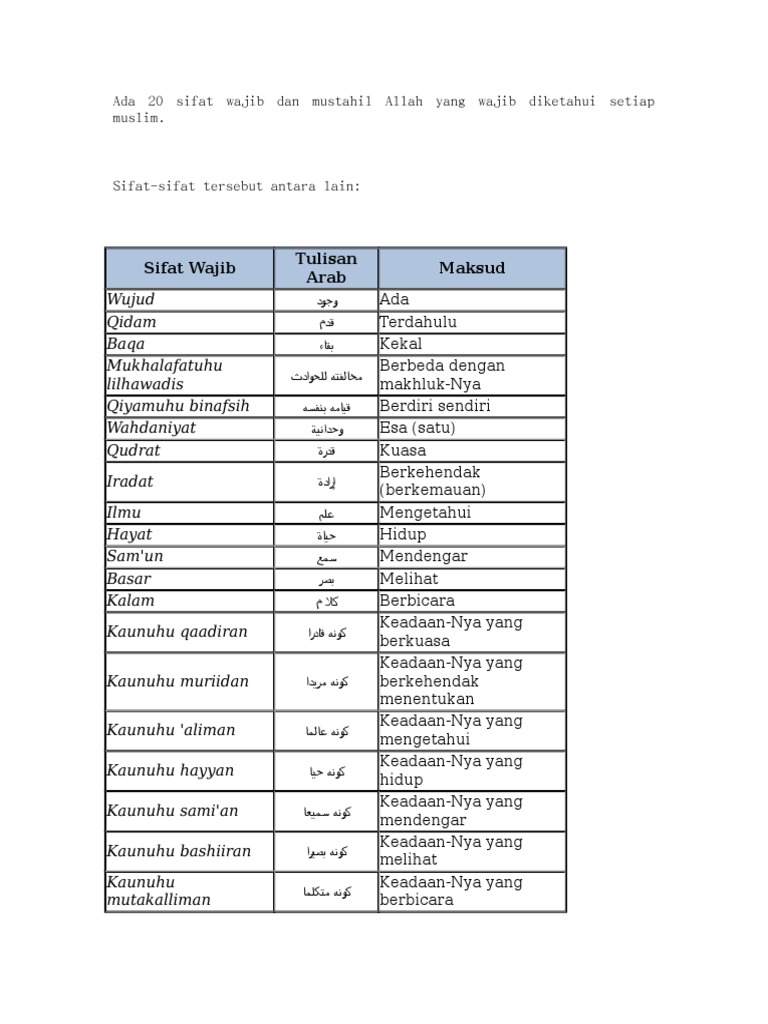 Para nabi dan rasul akan menjadi utusan allah di dunia sebagai tauladan dan mengajari umatnya. Ada 20 sifat wajib dan mustahil tuhan yang wajib diketahui setiap muslim. Terlebih sebagai orang tua yang harus menjelaskan kepada buah hati saat bertanya tentang hal itu. Allah maha berkehendak atas segala sesuatunya dan tidak ada yang mustahil baginya. Sifat allah merupakan sifat sempurna yang hanya dimili oleh allah swt. Melalui tauhid, kita belajar bagaimana cara beriman kepada allah. Allah memiliki 20 sifat wajib. Untuk lebih jelas mengenai sifat wajib dan mustahil allah, simak penjelasan berikut. Sebelum kita membahas mengenai sifat wajib dan mustahil allah. Sifat wajib dan sifat mustahil bagi allah. Segala sesuatu sesuai kehendaknya, apakah allah akan melakukan. Mustahil bagi allah memiliki sifat lemah atau tidak berkuasa. Dan mustahil allah hadits, karena segala sesuatu yang hadits harus membutuhkan sang pencipta (mujid) yang kelanjutannya akan mengakibatkan daur atau tasalul.
